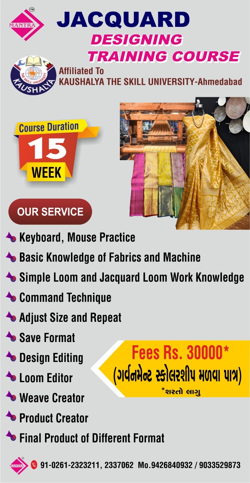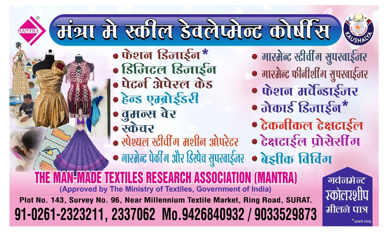 MANTRA has MOU with Kaushalya - The Skill University, Ahmedabad. In affiliation with Kaushalya - The Skill University, MANTRA offers specialized one-year courses in Fashion Design & Garment Technology, as well as a three-month course in Jacquard Design.